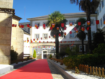 W Barbadelo zachodzimy do sklepiku z pamiątkami, prowadzonego przez rozmownego młodego Marokańczyka. Abdul gorąco radzi nam z góry zarezerwować w Portomarín nocleg, dzwoni do kilku schronisk i pensjonatów - wszędzie pozajmowane albo zostały tylko drogie pokoje! - i poleca szczególnie jedno schronisko, do którego chwilowo nie może się dodzwonić. Później Beata mówi, że to stary numer: zrobić wrażenie, że jest trudno o nocleg, i to wielkie szczęście, że właśnie tamten lokal nas przyjmie. A to pewnie jego znajomi, i pewnie ma od nich prowizję za polecenie. Na wszelki wypadek wziąłem jednak kontakt - zresztą na mojej rozpisce też jest. Cena zresztą dobra: 10 euro, a z mojej rozpiski wynika, że w Portomarín standard to 10-11 €. Gdy jesteśmy sam na sam, pyta, czy to moja córka (ciekawe, którą miał na myśli?) Dziewczyny tymczasem zastanawiają się nad pięknymi suwenirami, a ja zaopatruję się w gustowny, niedrogi, z dobrego materiału kapelusz z emblematem Camino - będzie jak znalazł na wędrówki polskimi szlakami jakubowymi! Zanim wyjdziemy ze sklepu, spotykamy tam naszego znajomego Polaka i Anglika-pisarza. Nocują tu blisko. My z Teresą kończymy dzień marszu o późniejszej godzinie niż inni, i stopniowo oswajamy z tym Beatę.